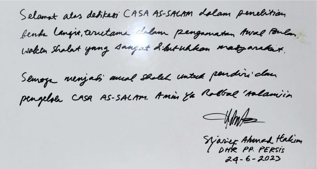 - Syarief Ahmad Hakim. (24 Juni 2023). Selamat atas dedikasi CASA As-salam dalam penelitian benda langit, terutama dalam pengamatan awal bulan, waktu shalat yang sangat dibutuhkan masyarakat. Semoga menjadi amal sholeh untuk pendiri dan pengelola CASA As-Salam. Amin ya Rabbil ‘Aalamiin.