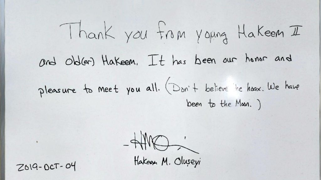 - Hakeem M. Oluseyi, Ph.D. (04 Oktober 2019). Thank you from Young Hakeem II and Old(er) Hakeem. It has been our honor and pleasure to meet you all. (Don’t believe the hoax. We have been to the Moon)