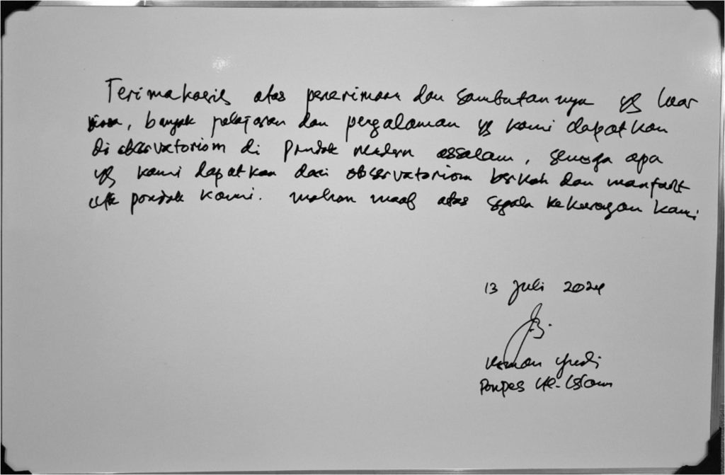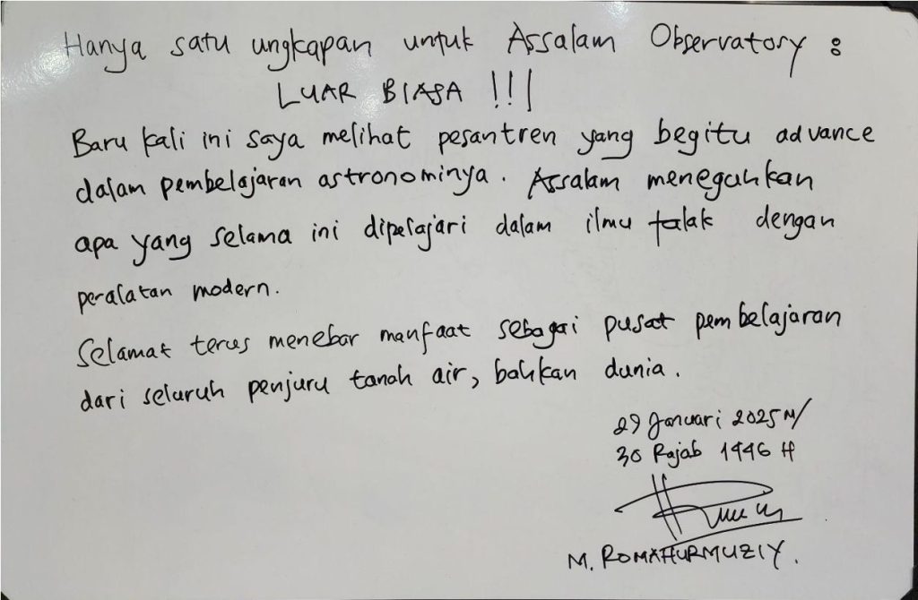 - Usman Yudi. (13 Juli 2024). Terima kasih atas penerimaan dan sambutannya yg luar biasa. Banyak pelajaran dan pengalaman yg kami dapatkan di Observatorium di Pondok Modern Assalam. Semoga apa yg kami dapatkan dari Observatorium berkah dan manfaat utk pondok kami. Mohon maaf atas segala kekurangan kami.