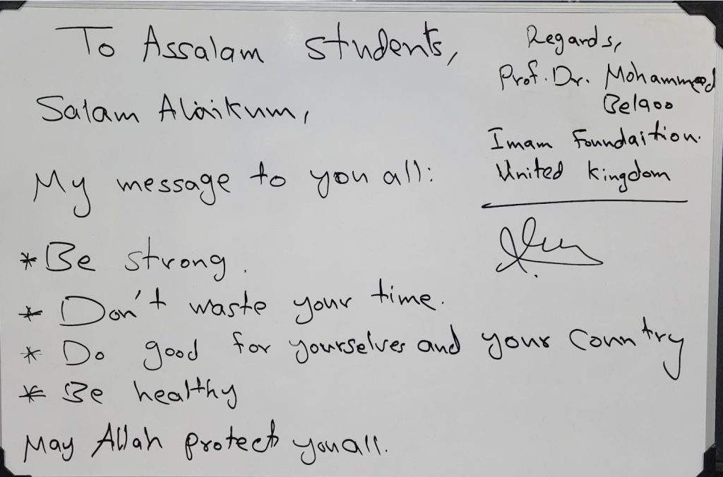 - Dr. Mohammed Belaoo. (5 September 2024). To Assalaam students, Salam Alaikum, My message to you all: be strong, don’t waste your time, do good for yourselves and your country, be healthy. May Allah protect you all.