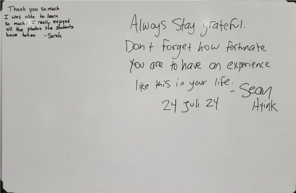 - Sean Hyink. (24 Juli 2024). Always stay grateful. Don’t forget how fortunate you are to have an experience like this in your life. Sarah. Thank you so much. I was able to learn so much! I really enjoyed all the photos the students have taken.