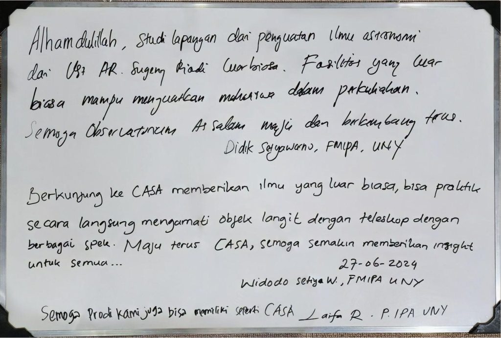 - Didik Setyawan. (27 Juni 2024). Alhamdulillah, studi lapangan dari penguatan ilmu astronomi dari Ust. AR Sugeng Riadi luar biasa. Fasilitas yang luar biasa mampu menguatkan mahasiswa dalam perkuliahan. Semoga Observatorium Assalam maju dan berkembang terus. Widodo Setiya W. Berkunjung ke CASA memberikan ilmu yang luar biasa, bisa praktik secara langsung mengamati objek langit dengan teleskop dengan berbagai spek. Maju terus CASA, semoga semakin memberikan insight untuk semua. Laifa R. semoga prodi kami juga bisa memiliki seperti CASA.