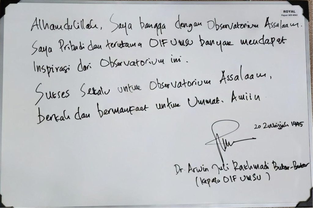 - Arwin Juli Rakhmadi Butar-Butar. (26 Juni 2024). Alhamdulillah. Saya bangga dengan Observatorium Assalaam. Saya pribadi dan terutama OIF UMSU banyak mendapat inspirasi dari Observatorium ini. Sukses selalu untuk Observatorium Assalaam, berkah dan bermanfaat untuk ummat. Amiin.
