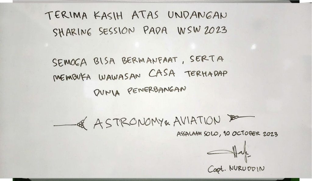 - Nuruddin. (10 Oktober 2023). Terima kasih atas undangan sharing session pada WSW 2023. Semoga bisa bermanfaat, serta membuka wawasan CASA terhadap dunia penerbangan. Astronomy & Aviation.