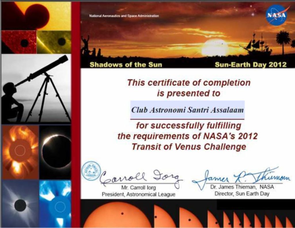 Selain media nasional, media dan institusi internasional sekelas NASA juga ikut memberikan penghargaan kepada para santri Assalaam yang telah berhasil menggelar pengamatan transit planet Venus dan terbuka untuk masyarakat umum. Penghargaan dari NASA diberikan dalam bentuk Sertifikat Keikutsertaan dalam even astronomi Transit Venus 2012.